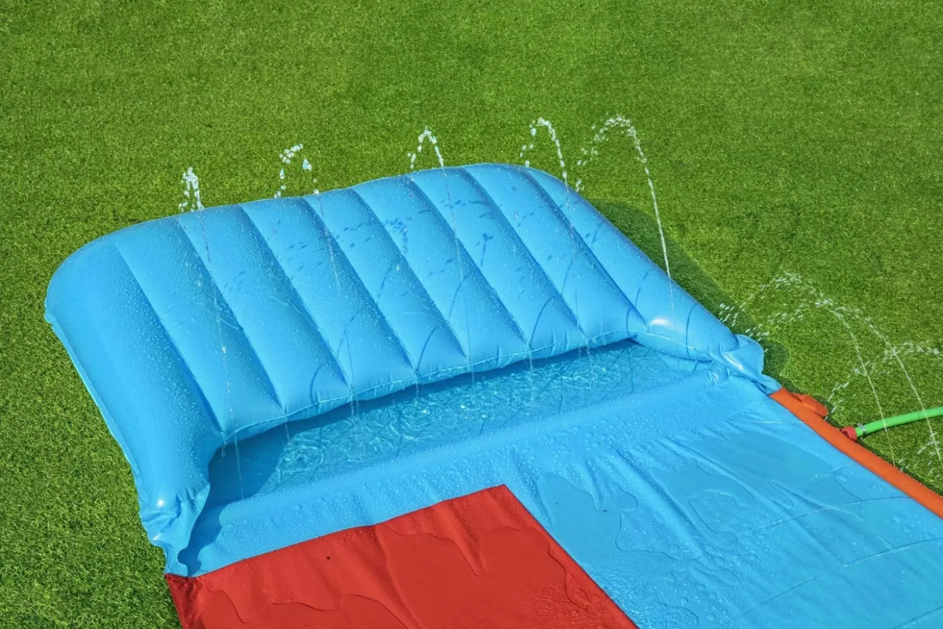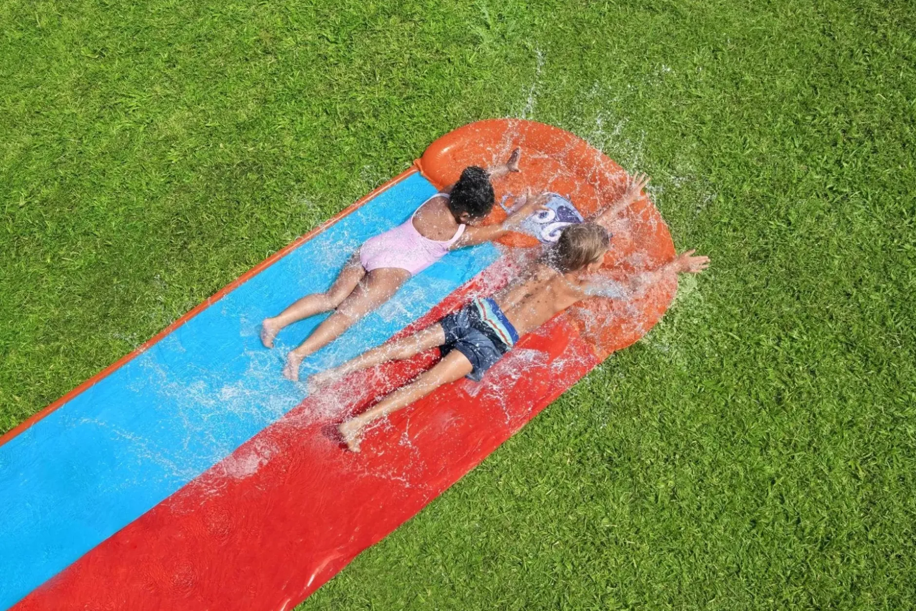 The H2Ogo!® Tsunami Splash Ramp™ Double Slide Will Create Endless Rides, Smiles, And Backyard Summer Fun! This 16 Ft. Double Slide Has A Tsunami Splash Ramp That Pushes Waves Of Water From Underneath The Ramp Creating An Incredibly Smooth, Fast And Wet Ride! The Tsunami Splash Ramp Also Creates A Soft Landing And Increases Speed With Every Slide. Combined With The Splashboost™ Sprinkler Technology, A System Built-In To Provide Targeted Water Coverage To Optimize Sliding, Spraying And Splashing, Kids Will Be Lining Up To Race Their Friends. With Water That Funnels Into A Big Splash Landing At The Finish Line, The Tsunami Splash Ramp Double Slide Is Designed To Keep Kids Cool And Create Wave After Wave Of Fun. The Quick And Easy Set-Up And Simple Takedown Of This Awesome Slide Will Have Both Parents And Kids Cruising Full-Speed Into A Summer Of Good Times.