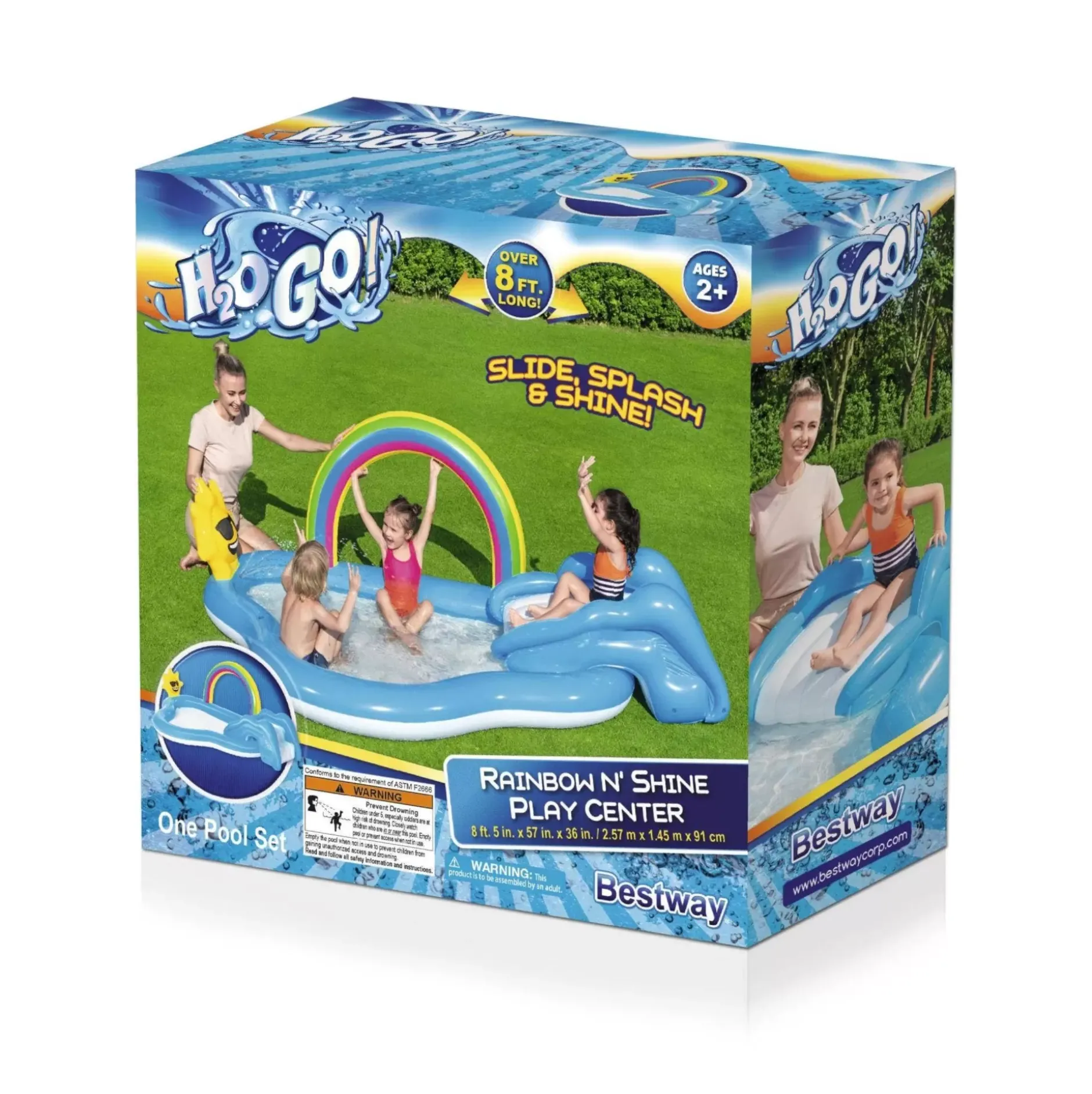 The H2Ogo!® Rainbow ‘N Shine Play Center Is Perfect For Hours Of Fun Under The Sun! With A Detachable Slide And A Cushioned Landing Area, Kids Will Be Begging To Go Outside And Play. Plus, An Extra-Large Kiddie Pool Means A Day Full Of Water-Filled Fun! Attach A Garden Hose And Water Will Spray Out Of The Sun, Adding An Extra Splash To Play Time. And When The Fun Is Done, Simply Drain The Water Through The Drain Valve And Fold Up For Easy Storage.