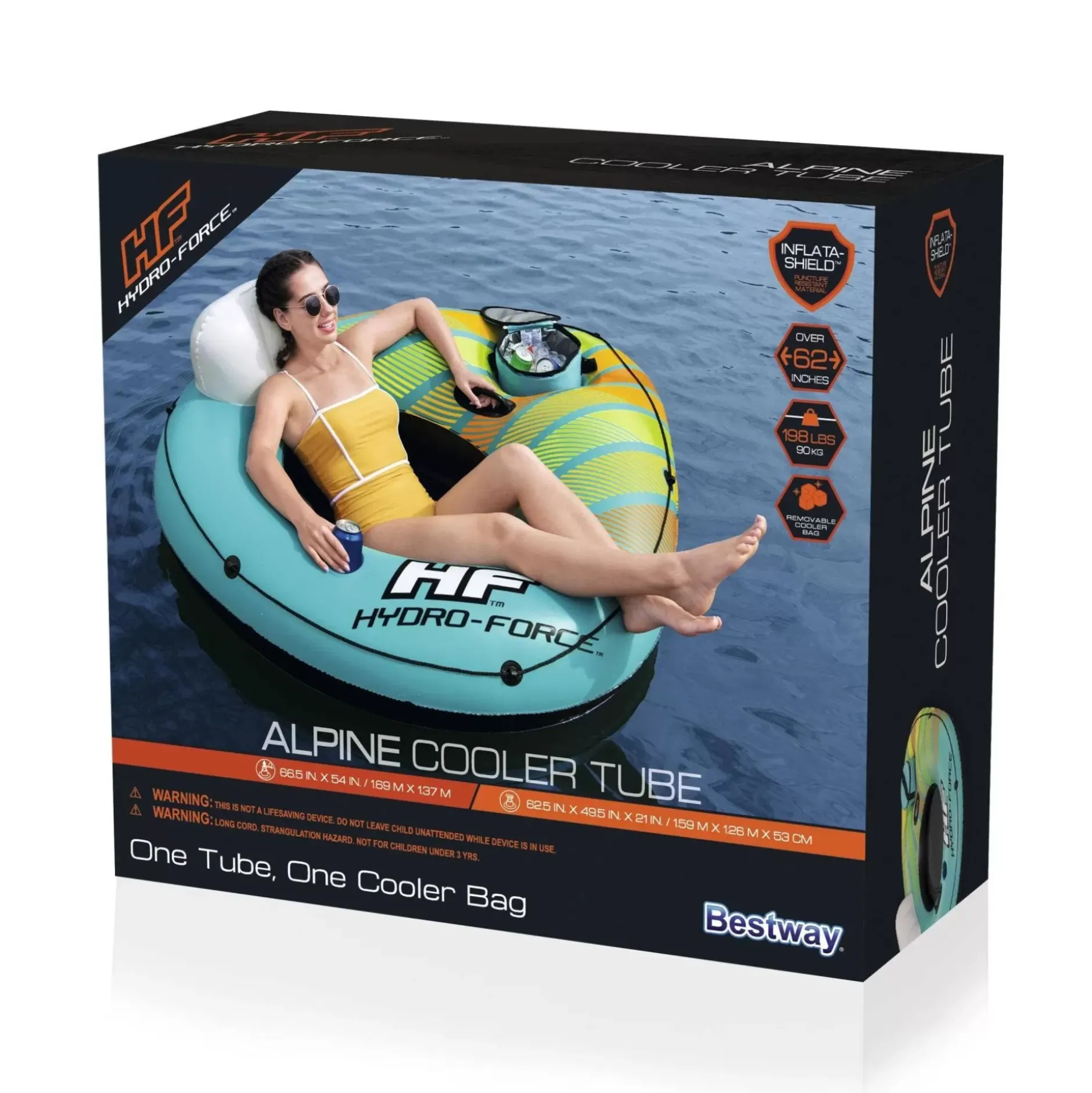 The Hydro-Force™ Alpine Cooler Tube’S Incredible Design Means No Longer Choosing Between Adventure And Convenience. Now, A Cold Drink Is Always An Arm’S Length Away, No Matter Where You’Re Headed! The Tube’S Removable Cooler Allows You To Pack Up Your Snacks And Drinks Before Hitting The Road, And The Water. After Inflating The Tube, Simply Place The Cooler In The Built-In Compartment And Let The Adventures Begin! Made To Fit Your Body And Designed To Provide Ultimate Comfort, The Mesh Bottom Keeps You Cool The Entire Ride While Still Providing Protection In The Water, And The Inflatable Backrest Provides Support All Day Long. The Built-In Cup Holder Is Perfect For Keeping Your Drink Safe And Secure All Day Long. This Tube Is Made With Inflata-Shield™ Material That Resists Puncture, Limits Stretching And Enhances Grip. Heavy-Duty Handles Also Provide Assistance When Adjusting Or Exiting Your Tube, While The Wraparound Grab Rope Makes Getting In And Out Of Your Tube A Breeze. Plus You Can Tie Up For Epic Group Trips! The Alpine Cooler Tube Puts Your Comfort And Convenience First, Making Every Day On The Water The Best One Yet!