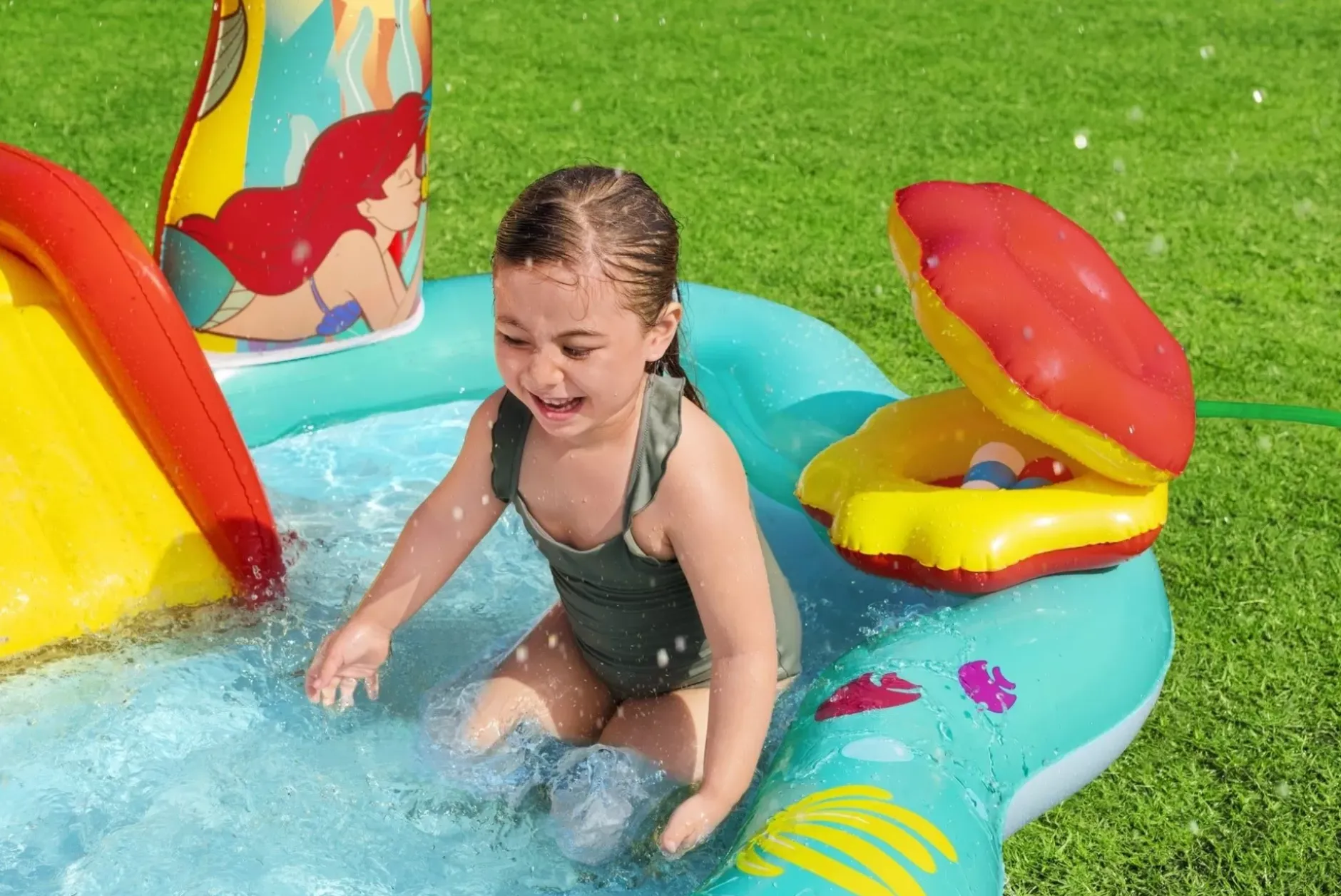 Get Ready For An Undersea Adventure With The Disney® Little Mermaid Inflatable Kids Water Play Center! Simply Inflate The Play Center And Fill The Pool With Water, Attach A Garden Hose (Not Included) To The Archway To Activate The Sprayer, And Let The Exploration Begin.Featuring A Built-In Slide Fused To The Bottom For Extra Safety And Security, The Rainbow Arch Sprays Water As Your Kids, Ages 2 And Up, Splash Into A Lagoon And Slide Into The Pool Below. Watch As They Make Waves Tossing 3 Star-Shaped Rings In A Friendly Game Of Coral Ring Toss. Or, They Can Take Turns Playing The Seashell Ball Toss Game With The 6 Included Balls To See Who Can Score The Most Points. When The Kids Are Done Splashing And Playing, Release The Pool Water With The Easy-To-Use Drain Valve.Enjoy The Play Center With Or Without Water For Year-Round Fun And Excitement. The Little Mermaid Is Always Ready To Go On A New Adventure!
