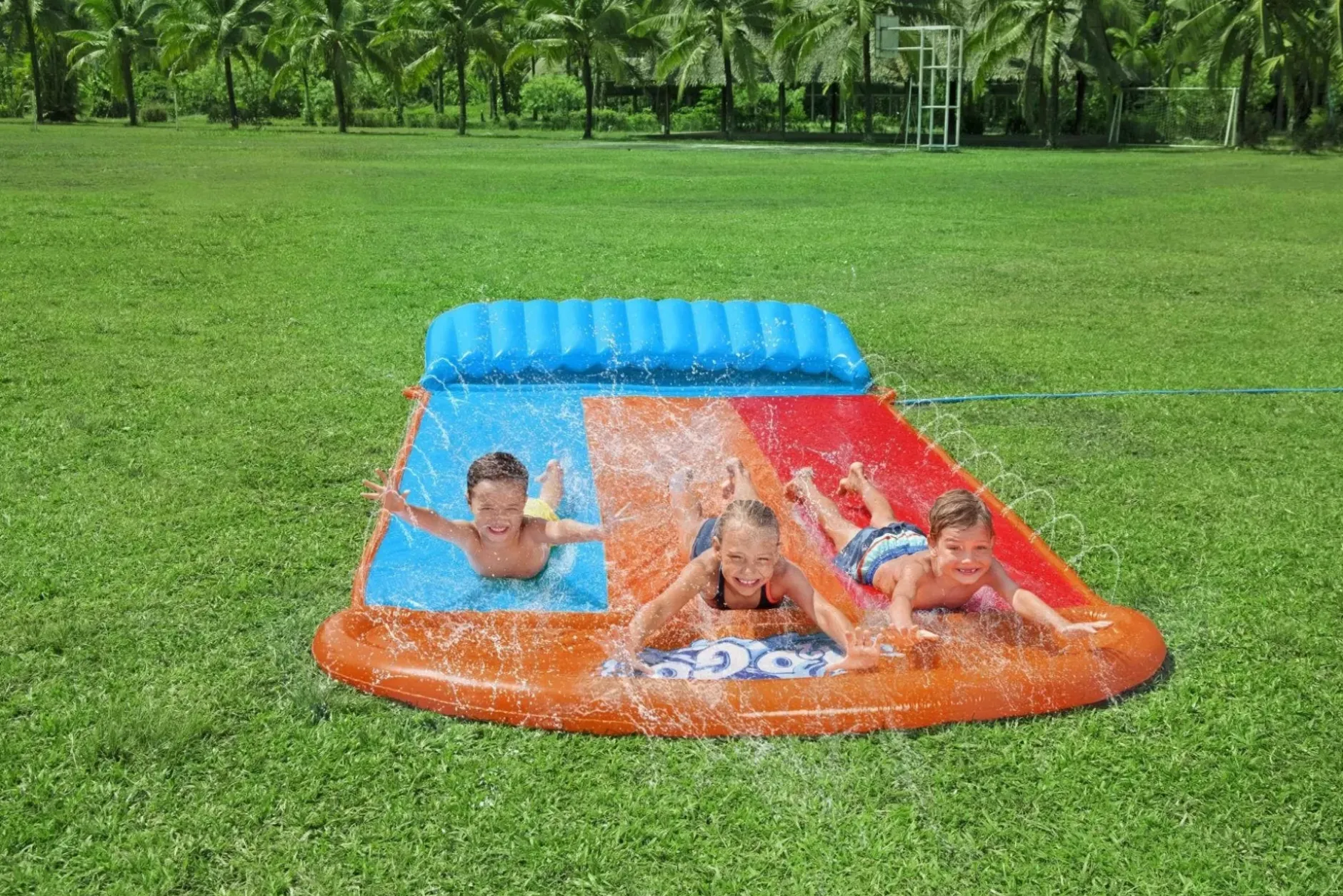 The H2Ogo!® Tsunami Splash Ramp™ Triple Slide Will Create Endless Rides, Smiles, And Backyard Summer Fun! This 16 Ft. Triple Slide Has A Tsunami Splash Ramp That Pushes Waves Of Water From Underneath The Ramp Creating An Incredibly Smooth, Fast And Wet Ride! The Tsunami Splash Ramp Also Creates A Soft Landing And Increases Speed With Every Slide. Combined With The Splashboost™ Sprinkler Technology, A System Built-In To Provide Targeted Water Coverage To Optimize Sliding, Spraying And Splashing, Kids Will Be Lining Up To Race Their Friends. With Water That Funnels Into A Big Splash Landing At The Finish Line, The Tsunami Splash Ramp Triple Slide Is Designed To Keep Kids Cool And Create Wave After Wave Of Fun. The Quick And Easy Set-Up And Simple Takedown Of This Awesome Slide Will Have Both Parents And Kids Cruising Full-Speed Into A Summer Of Good Times.