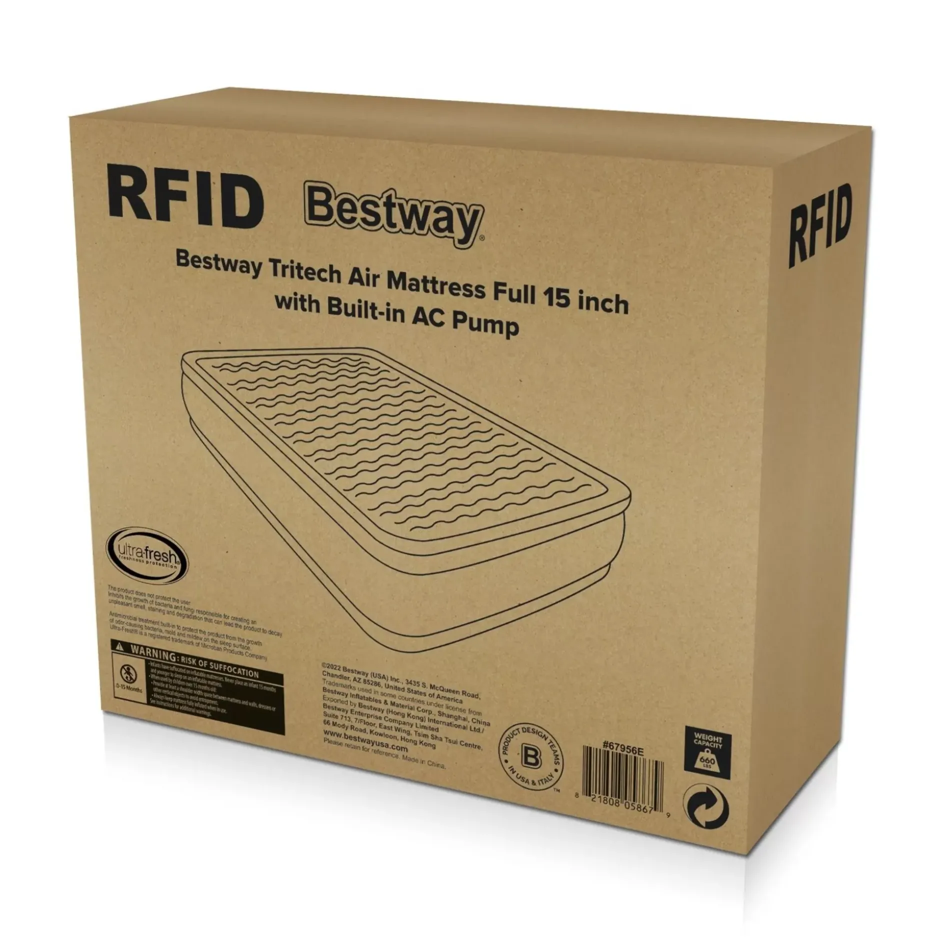 Wake Up Renewed And Refreshed On The Bestway® Tritech™ Air Mattress! This 15 In. Tall, Full-Sized Bed Promises Strength, Durability And Comfort All Night Long. Its Compact Size And Built-In Pump Make It Quick And Convenient For Use Whenever You Need It. Plus, With The Ultra-Fresh™ Antimicrobial Surface, Your Bed Will Be Protected From The Growth Of Odor-Causing Bacteria, Mold And Mildew On The Sleep Surface.Durable Construction:With A Comfortable Sleeping Surface And Sturdy Construction, A Great Night’S Sleep Is Right Around The Corner. The Internal Structure Of This Bed Is Made With Tritech™ Material Offering Durability And Strength, While Also Allowing The Mattress To Keep The Same Shape No Matter How Many Times It’S Inflated And Deflated. Specifically Engineered For Firmness, This Material Minimizes Air Loss Throughout The Night. Tritech Material Increases Internal Stretch-Resistance And Provides Contoured Support For All Night Comfort. This Durable, Stress-Tested Material Can Withstand All Of The Weight And Movement That Comes With A Great Night’S Sleep.Simple Setup:This Air Mattress Inflates In 3-4 Minutes So It Is Ready For Bed When You Are. The Built-In Pump Allows For Easy Inflation, And The Quick Deflate Screw Valve Allows For Easy Deflation After Use. Simply Place Your Flattened Bed In The Included Carrying Bag For Easy Transport And Storage.