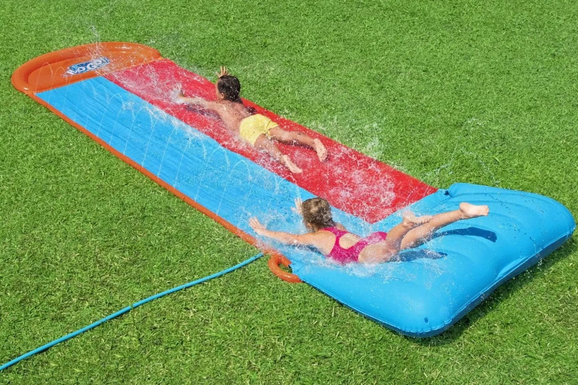 The H2Ogo!® Tsunami Splash Ramp™ Double Slide Will Create Endless Rides, Smiles, And Backyard Summer Fun! This 16 Ft. Double Slide Has A Tsunami Splash Ramp That Pushes Waves Of Water From Underneath The Ramp Creating An Incredibly Smooth, Fast And Wet Ride! The Tsunami Splash Ramp Also Creates A Soft Landing And Increases Speed With Every Slide. Combined With The Splashboost™ Sprinkler Technology, A System Built-In To Provide Targeted Water Coverage To Optimize Sliding, Spraying And Splashing, Kids Will Be Lining Up To Race Their Friends. With Water That Funnels Into A Big Splash Landing At The Finish Line, The Tsunami Splash Ramp Double Slide Is Designed To Keep Kids Cool And Create Wave After Wave Of Fun. The Quick And Easy Set-Up And Simple Takedown Of This Awesome Slide Will Have Both Parents And Kids Cruising Full-Speed Into A Summer Of Good Times.