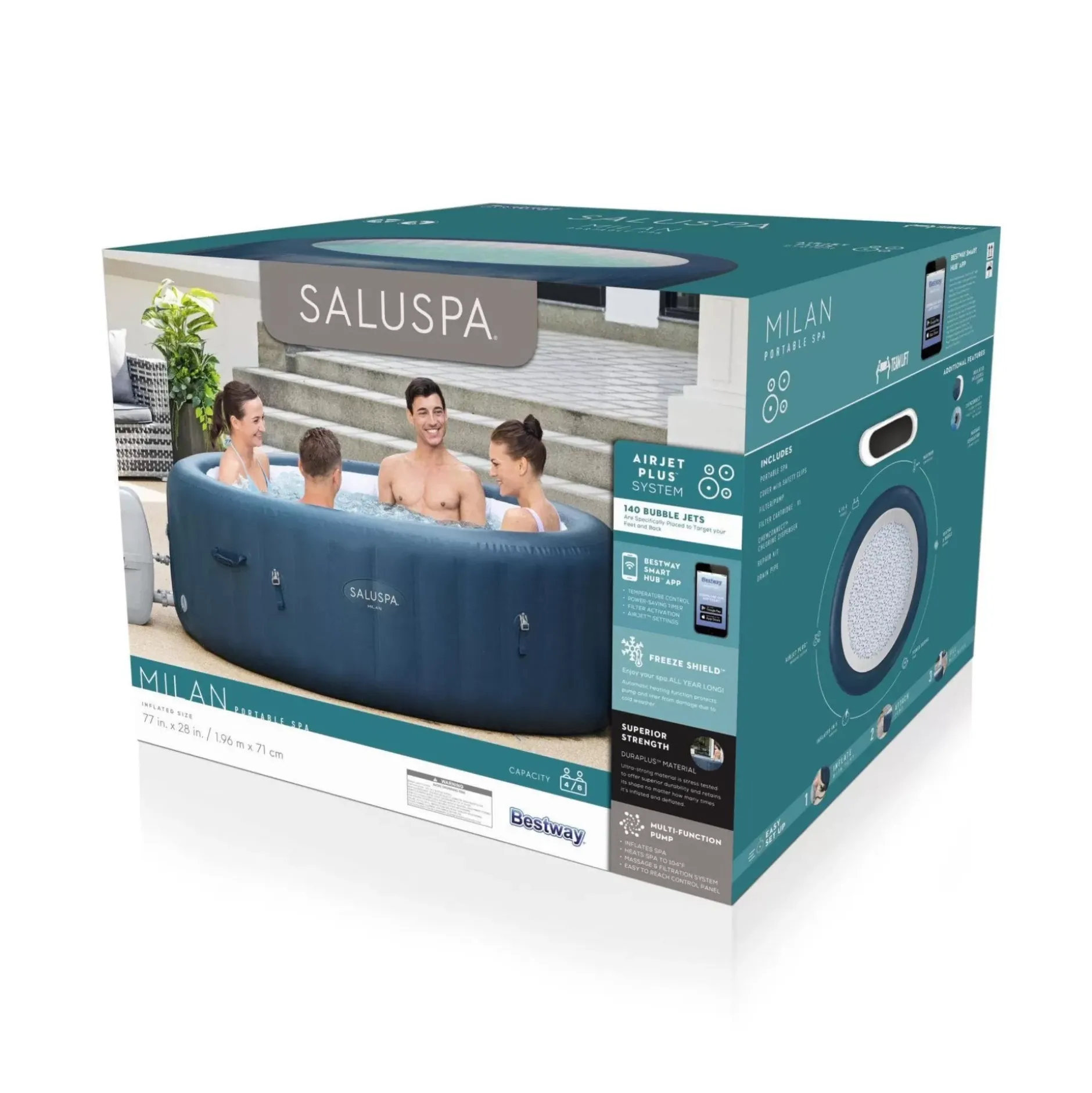 After A Long Day, There’S Nothing More Relaxing Than Sinking Into Warm, Bubbling Water Right In Your Own Backyard. The Saluspa® Milan Airjet Plus™ Provides An Enhanced, Soothing Massage Experience For Up To 6 People, While Still Being Quick And Easy To Set Up. This Spa Reaches Up To 104ºf (40ºc) To Provide Ultimate Relaxation As You Are Surrounded By 140 Airjet Massage Bubbles. Simply Attach The Pump And Watch As It Inflates. Control At Your Fingertips: This Unique Spa Can Be Controlled From Your Smart Device Through The Bestway Smart Hub™ App. This New Innovation Makes The Milan One Of The Most Convenient Spas On The Market. The App Lets You Set Your Spa To The Perfect Temperature, Activate The Power Saving Timer, Run The Water Filter And Control The Airjet Plus Massage System – All From The Palm Of Your Hand. Soothing Massage System: 140 Airjet Plus Bubbles Are Released From The Center And Sides Of The Bottom Of The Spa To Target Your Legs And Back With A Soothing Massage. Designed To Provide The Ultimate Comfort And Relaxation Experience, This Massage System Features Two Intensity Levels, So Your Relaxation Time Is Completely Customizable.Durable Construction:This Spa’S Inflatable Walls Are Made Of Durable, Puncture-Resistant, Duraplus™ Material Which Prevents Damage. Compared To Pvc, Duraplus 3-Layer Material Is 33% More Tear Resistant And 56% More Stretch Resistant. This Type Of Internal Construction Prevents Expansion Over Time, Allowing The Spa To Retain The Same Shape No Matter How Many Times It’S Inflated And Deflated.Innovative Winterizing Technology:The Included Freeze Shield™ Automatic Heating Function Prevents Inner Components From Freezing During Colder Temperatures. Designed With Innovative Winterizing Technology, The System Will Keep The Internal Temperatures Between 42º And 50ºf (6º And 10ºc) To Prevent Damage.Electrical Safety Information:Our Spas Feature A Ground Detection System That Ensures The Spa Is Used With An Outlet Having A Proper Ground Connection, Providing Additional Electric Current Protection. Only Use A Grounded Socket Corresponding To The Electrical Rating Of The Attachment Plug. Never Use An Extension Cord Or Multi-Plug Adaptor. Be Sure To Regularly Inspect Both The Plug And Socket For Signs Of Damage, And Do Not Plug The Product Back Into The Socket If Damage Is Found. Read The Manual Thoroughly Before Setting Up Your Hot Tub.Contents: Equipped With A Pump That Quickly Inflates The Spa, Heats It Up, Runs Filtration And Controls The Massage System, This Spa Is Both Easy And Convenient. The Pump Can Easily Be Reached From Inside The Spa And Features Cup Holders For Drinks And Snacks. Also Included Is A Chemconnect™ Dispenser That Maintains Clean, Healthy Water By Evenly Dispersing The Proper Amount Of Chlorine. To Top It All Off, The Milan Spa Comes With A Reinforced Cover That Locks In Heat While Not In Use, As Well As Keeping Dust And Debris From Collecting On The Water.The Original Premium Portable Spa™:Saluspa Is The Original Manufacturer Of The World’S First Premium Portable Spa. A Little Over A Decade Of Advanced Engineering Innovations Have Built A Name That Consumers Have Grown To Trust.