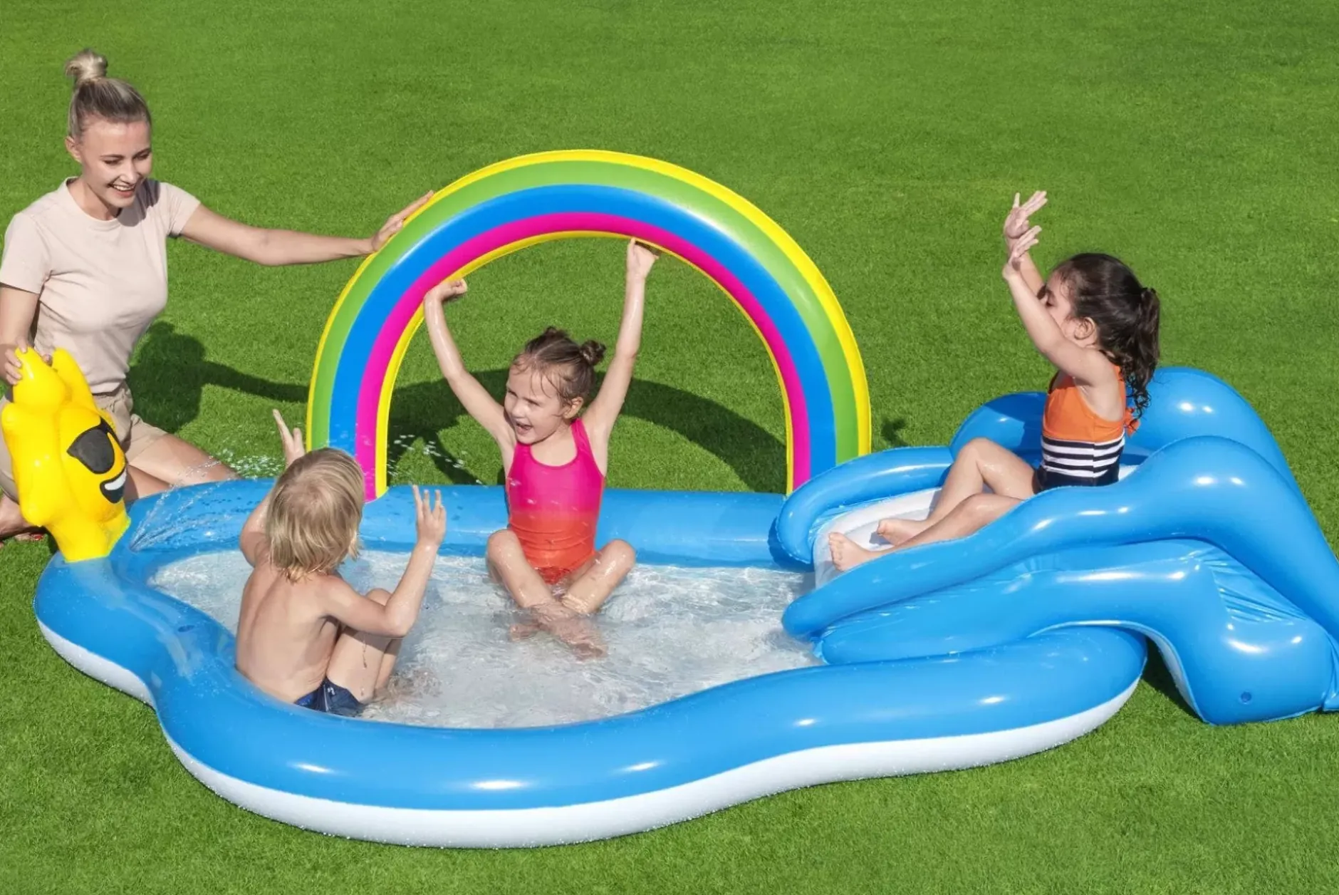 The H2Ogo!® Rainbow ‘N Shine Play Center Is Perfect For Hours Of Fun Under The Sun! With A Detachable Slide And A Cushioned Landing Area, Kids Will Be Begging To Go Outside And Play. Plus, An Extra-Large Kiddie Pool Means A Day Full Of Water-Filled Fun! Attach A Garden Hose And Water Will Spray Out Of The Sun, Adding An Extra Splash To Play Time. And When The Fun Is Done, Simply Drain The Water Through The Drain Valve And Fold Up For Easy Storage.