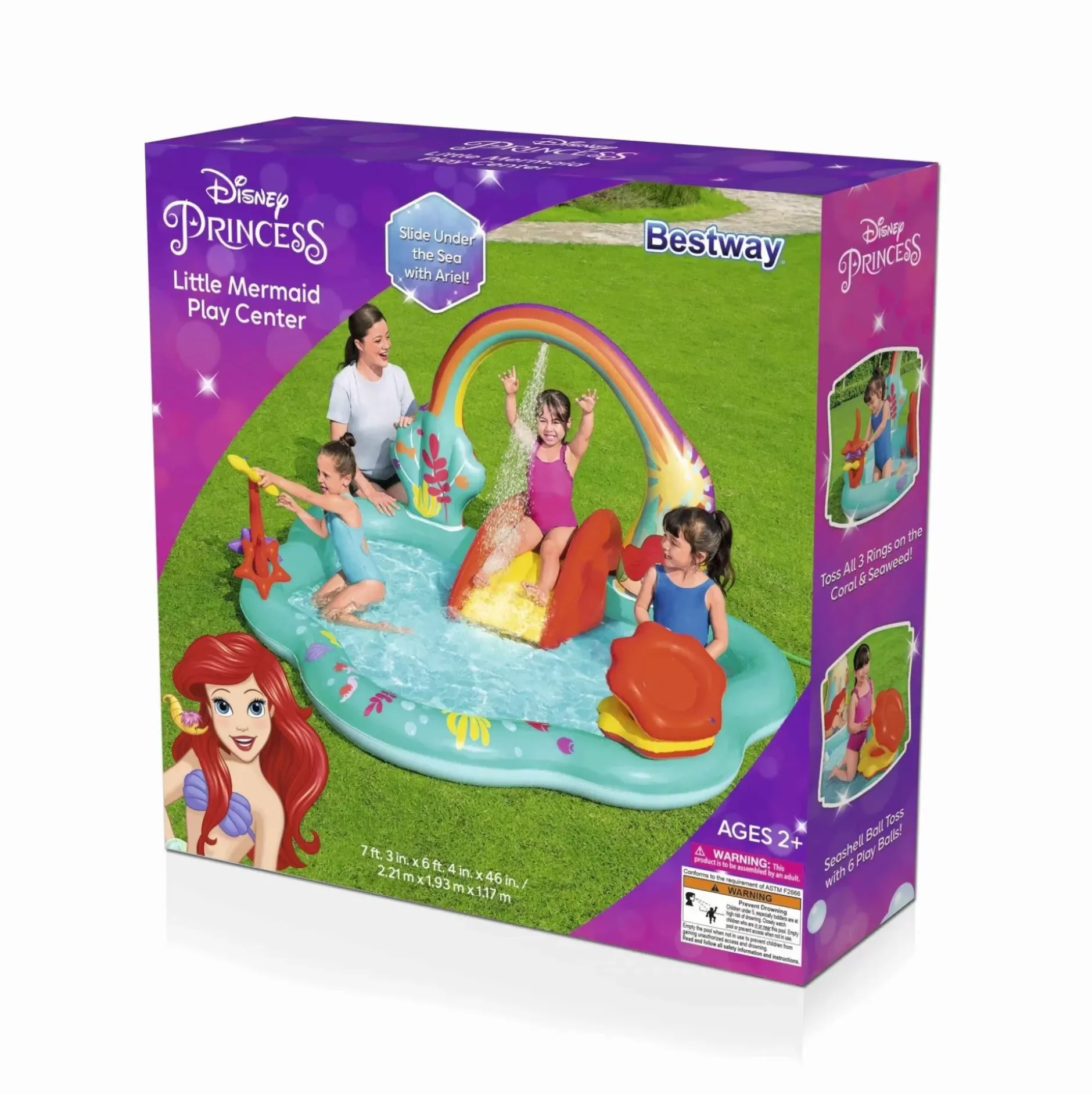 Get Ready For An Undersea Adventure With The Disney® Little Mermaid Inflatable Kids Water Play Center! Simply Inflate The Play Center And Fill The Pool With Water, Attach A Garden Hose (Not Included) To The Archway To Activate The Sprayer, And Let The Exploration Begin.Featuring A Built-In Slide Fused To The Bottom For Extra Safety And Security, The Rainbow Arch Sprays Water As Your Kids, Ages 2 And Up, Splash Into A Lagoon And Slide Into The Pool Below. Watch As They Make Waves Tossing 3 Star-Shaped Rings In A Friendly Game Of Coral Ring Toss. Or, They Can Take Turns Playing The Seashell Ball Toss Game With The 6 Included Balls To See Who Can Score The Most Points. When The Kids Are Done Splashing And Playing, Release The Pool Water With The Easy-To-Use Drain Valve.Enjoy The Play Center With Or Without Water For Year-Round Fun And Excitement. The Little Mermaid Is Always Ready To Go On A New Adventure!