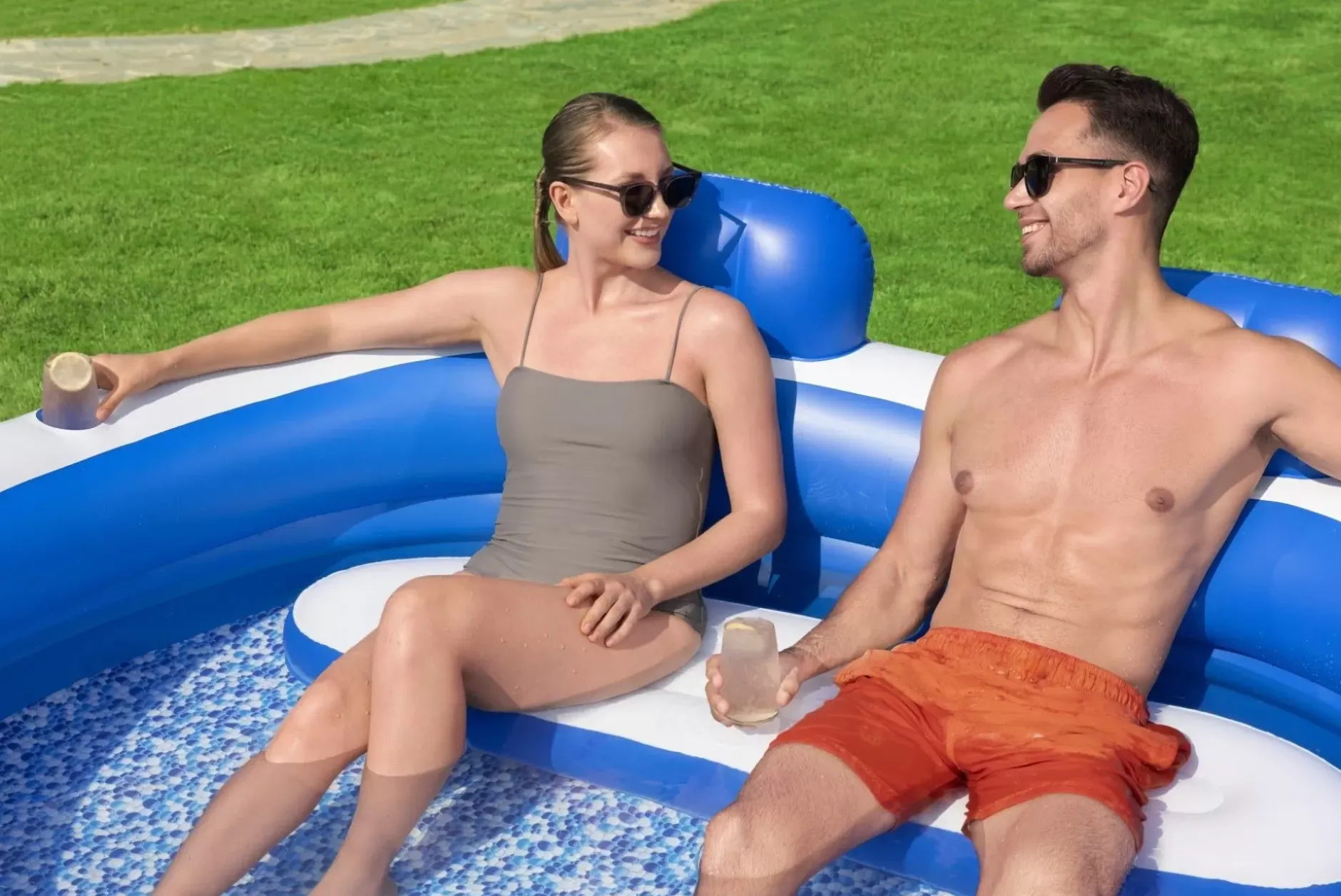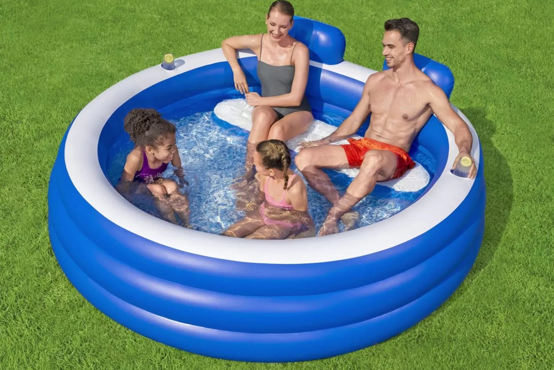 Enjoy A Little Slice Of Heaven In Your Own Backyard With The H2Ogo!® Splash Paradise™ Family Pool! Designed For Families With Children Ages 6 And Up, The Splash Paradise Family Pool Features A Realistic Mosaic Printed Floor And Has A Water Capacity Of 225 Gallons (852 L). The Pool Also Features A Comfortable Bench Seat With Two Headrests To Lean Back And Enjoy The Sunshine, And Two Cup Holders For Your Choice Of Refreshing Beverages. With Three Equal Rings And Extra-Wide Sidewalls For More Stability, The Splash Paradise Family Pool Will Make A Great Addition To Your Family’S Backyard Fun!